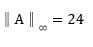 반대로 각 행마다 모든 열을 합하고, 그 중 최댓값을 구한 경우를 maximum norm 혹은 infinity norm이라고 한다. 행렬 A의 경우 첫 행 1+2+3 = 6 / 두번째 행 4+5+6 = 15 / 세번쨰 행 7+8+9 = 24 중 가장 큰 값인 24가 해당한다. 기호의 경우 절댓값 두 번에 아래첨자 무한대 기호를 사용한다.
