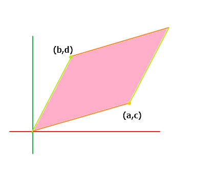 2) 기하학적으로도 아래의 사각형 넓이가 ad-bc의 행렬값과 같다. 같은 논리로 3X3 행렬의 경우에는 3차원 육면체의 부피를 의미하기도 한다.