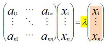위와 같은 방식으로 계산하면 된다. 이 계산을 거치면 nxn의 정방행렬이 n 크기의 벡터가 되는데, 이 벡터값이 원래의 x벡터에 λ를 곱해 나올 수 있으면, 바로 그 값들이 고유벡터와 고윳값이 되는 것이다.