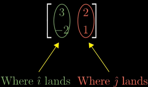 변환을 알아내는 방법은 단순하다. 기저벡터의 변화량을 알기만 하면 되기 때문이다. 위 예시에서, 기저벡터 i의 경우 변환 후 (1,-2)가 되었고, j의 경우 (3,0)이 되었다. 이 값들을 기존 벡터에 곱하면 변환 후의 값을 알 수 있게 된다.