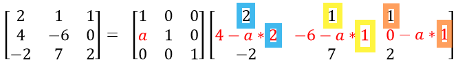 좌변의 행렬 A를 우변처럼 두 삼각행렬로 만들어야 한다. 차근차근 단계별로 진행해 보자.