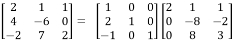 어떤 행렬 A를 Lower matrix와 Upper matrix의 곱으로 분해한다. A=LU