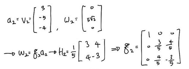 두 번째. a2와 q2의 경우 대각 성분을 1로, 첫 행과 첫 열의 성분을 0으로 두고 나머지를 찾을 수 있다. 만일 3x3보다 더 큰 행렬의 경우 이와 같이 계속해서 바깥의 행과 열을 하나씩 제거하며 찾을 수 있다.