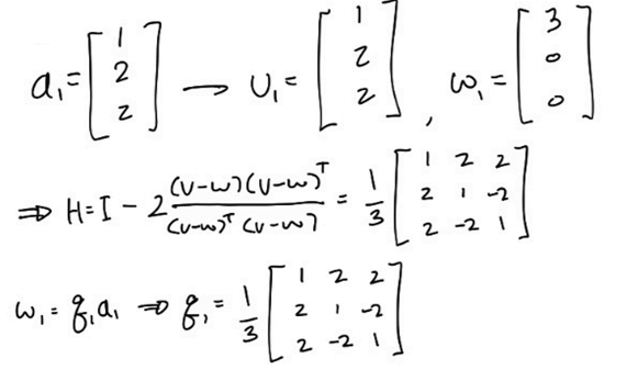 직교행렬과 같은 특성을 가지고 있기에 하우스홀더 행렬을 활용해서도 QR분해를 해 볼 수 있다는 걸 알 수 있다.