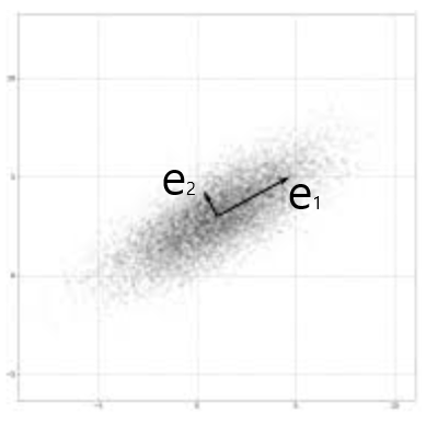 이 데이터들의 분산이 가장 큰 방향이 바로 e1벡터의 방향이고, e1벡터에 수직이며 두 번째로 큰 방향이 e2이다. 크기 또한 이 벡터들의 크기와 같고, 이 두 방향벡터가 바로 주성분 벡터이다. 만일 데이터의 종류가 더 많아 3차원, 4차원 데이터로 점점 늘어난다면, 이 주성분 벡터 또한 하나씩 증가한다.