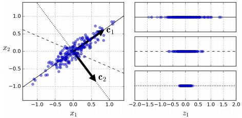 세 가지 축이 있지만, 가장 큰 분산을 따르는 c1 축을 선택하는 것이 원본을 가장 잘 나타낸다(정보 손실이 가장 적다). 따라서 우리는 PCA를 통해 분산이 가장 큰 축을 찾고, 남은 분산을 가장 잘 표현하는 축 e2를 찾는 것이다.