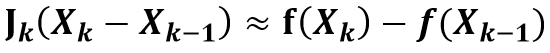 이 두 방정식을 열 벡터화하고, 타일러 급수를 거치면 아래와 같은 식으로 바꿀 수 있다.