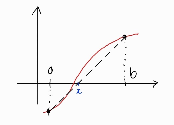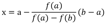 Bisection method와 같은 알고리즘을 사용하지만, 이 방법에서는 a와 b의 중점 m을 사용하는 방식이 아닌 f(a)와 f(b)를 이은 직선의 x절편을 사용한다. 두 점을 지나는 직선의 방정식을 사용하거나 하여 x절편의 위치를 구하면 아래와 같다.