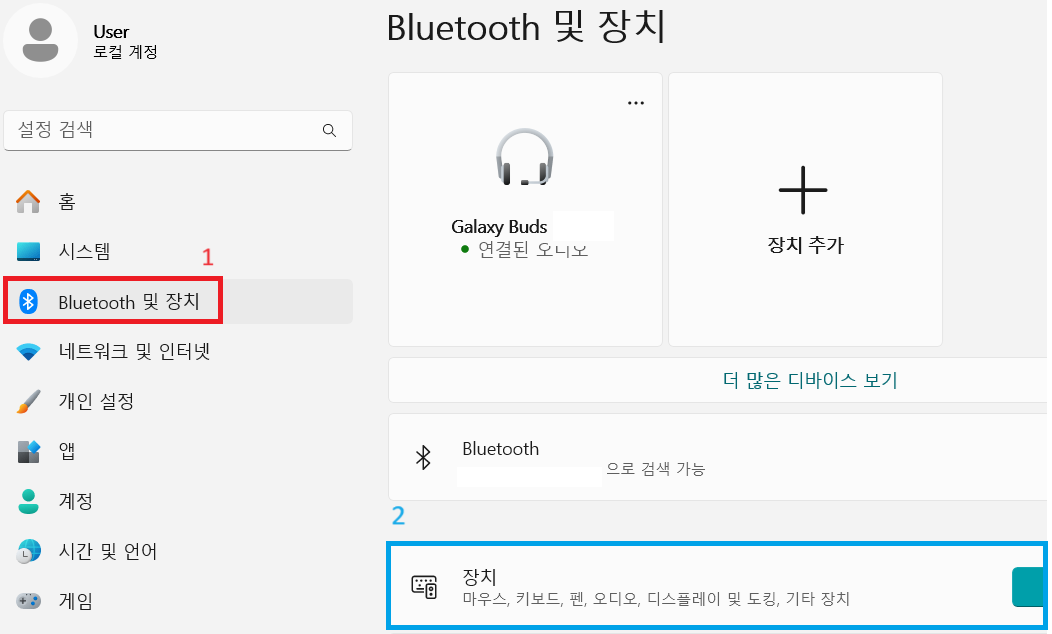 1. 검색창 "설정" 검색 후 클릭 -> Bluetooth 및 장치 클릭 -> "장치" 탭 클릭