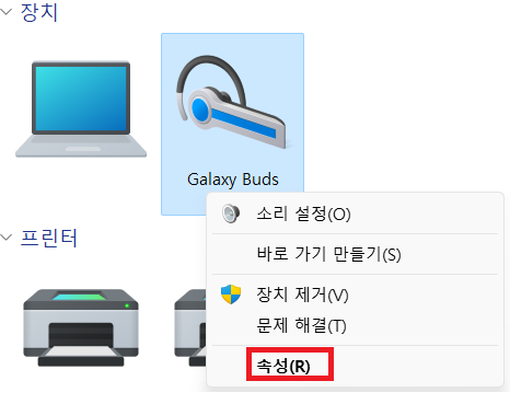 3. 드디어 기어 나온 장치 및 프린터 탭에서 내 이어폰 우클릭 -> '속성' 클릭