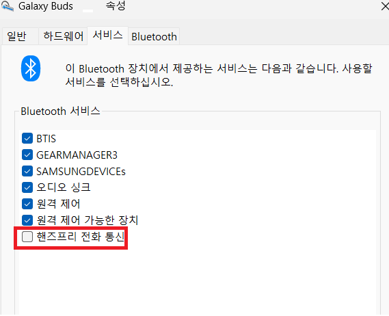 4. 모든 일의 원흉 "핸즈프리 전화 통신" 체크박스 해제. 해제 후 적용/확인 누르면 소리가 나온다